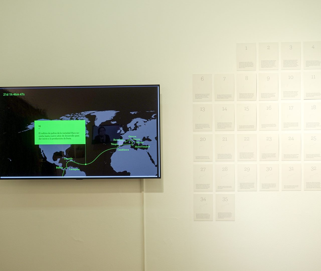 Carrasco muestra dicha ruta en tiempo real desde la inauguración de esta exposición hasta su clausura, a través de una infografía en la que hace seguimiento al viaje de un contenedor marítimo de palta desde el puerto del Callao hasta su destino final: Barcelona. La animación se acompaña de 35 fichas impresas a modo de calendario que, en cada uno de los días del viaje, aporta información del cultivo, exportación y consumo de dicha fruta.